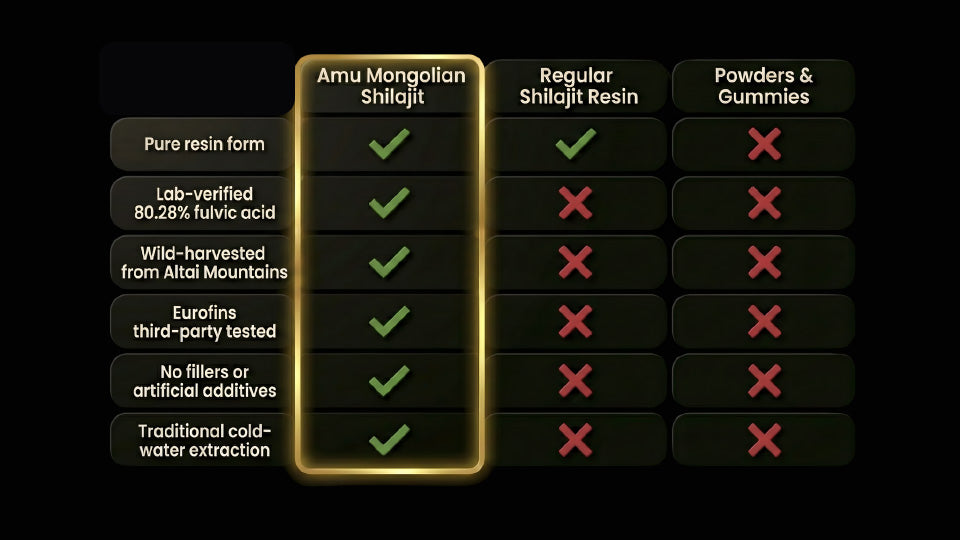 Amu Mongolian Shilajit refuels you at the source, delivering up to 80.28% fulvic acid and 85+ bioavailable minerals directly into your cells for steady, natural vitality.